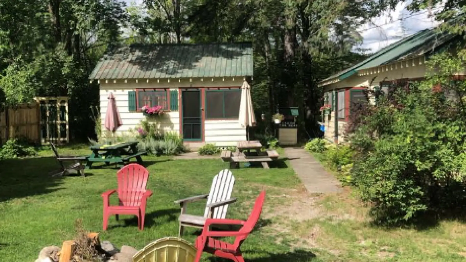 Each of our cabins are comfortable and home-like, offering a screened-in porch, kitchen, bathroom with shower, bedroom, and a heater or fam to feel at ease in any weather. While lodging with us, you will have access to free WiFi, Smart TV with DVD player, and a sizable community yard with a family picnic table, Adirondack chairs, propane grill, and fire pit with firewood – all available for use at your leisure. We are pet friendly for an additional charge.